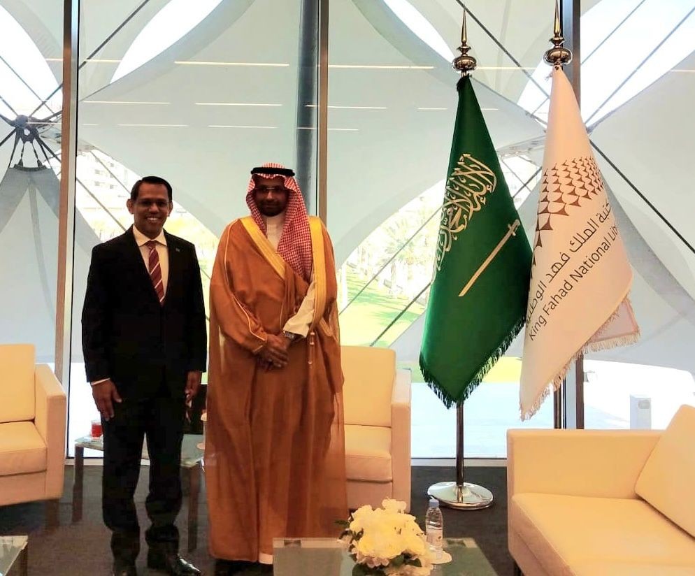 Ambassador Ahmed Sareer visited the King Fahd National Library and held a meeting with His Excellency, Dr. Yazeed bin Mohamed Al-Homaidhan, Secretary General of the Library. During the visit, the Ambassador was briefed on the Library’s role in spreading knowledge and maintaining a culture of learning across all ages. Discussions were also held on sharing of expertise and learning between Maldives and the Kingdom of Saudi Arabia.
