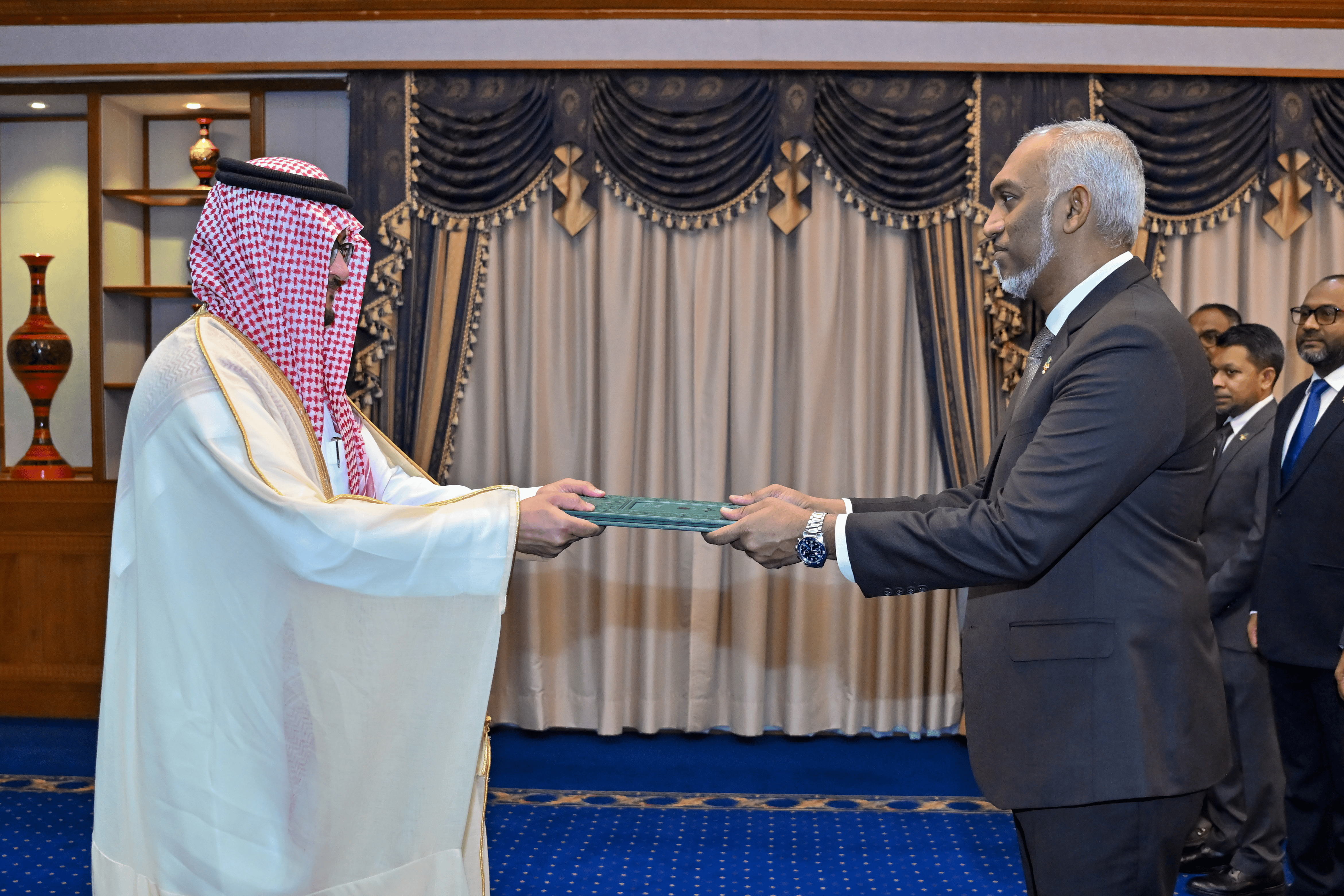 Following the presentation, the President and the Ambassador discussed areas of mutual interest. The President expressed appreciation for Saudi Arabia’s continued support to the Maldives, particularly the brotherly relations upheld by The Custodian of the Two Holy Mosques King Salman Bin Abdulaziz Al Saud, King of the Kingdom of Saudi Arabia, His Royal Highness Prince Mohammed bin Salman bin Abdulaziz Al Saud, Crown Prince and Prime Minister of the Kingdom of Saudi Arabia, and the government and people of Saudi Arabia. He further reaffirmed his support for Saudi Arabia.