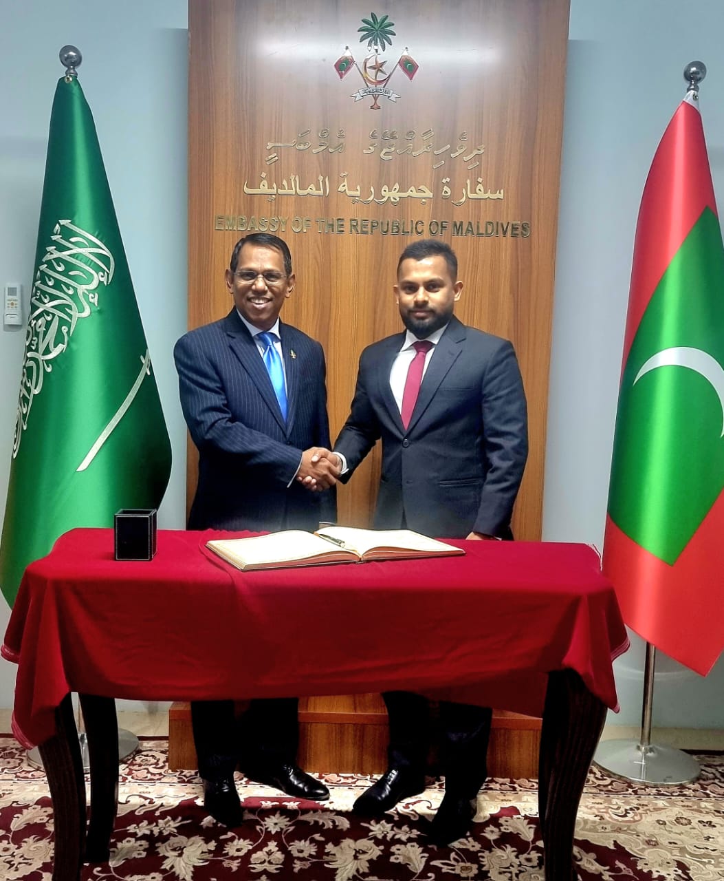 Foreign Minister Dr. Khaleel was accompanied to the meeting by Ambassador of Maldives to the Kingdom of Saudi Arabia, Ahmed Sareer, Secretary, Bilateral Dr. Hala Hameed, Joint Secretary Ms. Khadeeja Najeeha and Counsellor at the Embassy of Maldives in Saudi Arabia, Ahmed Fazeel.